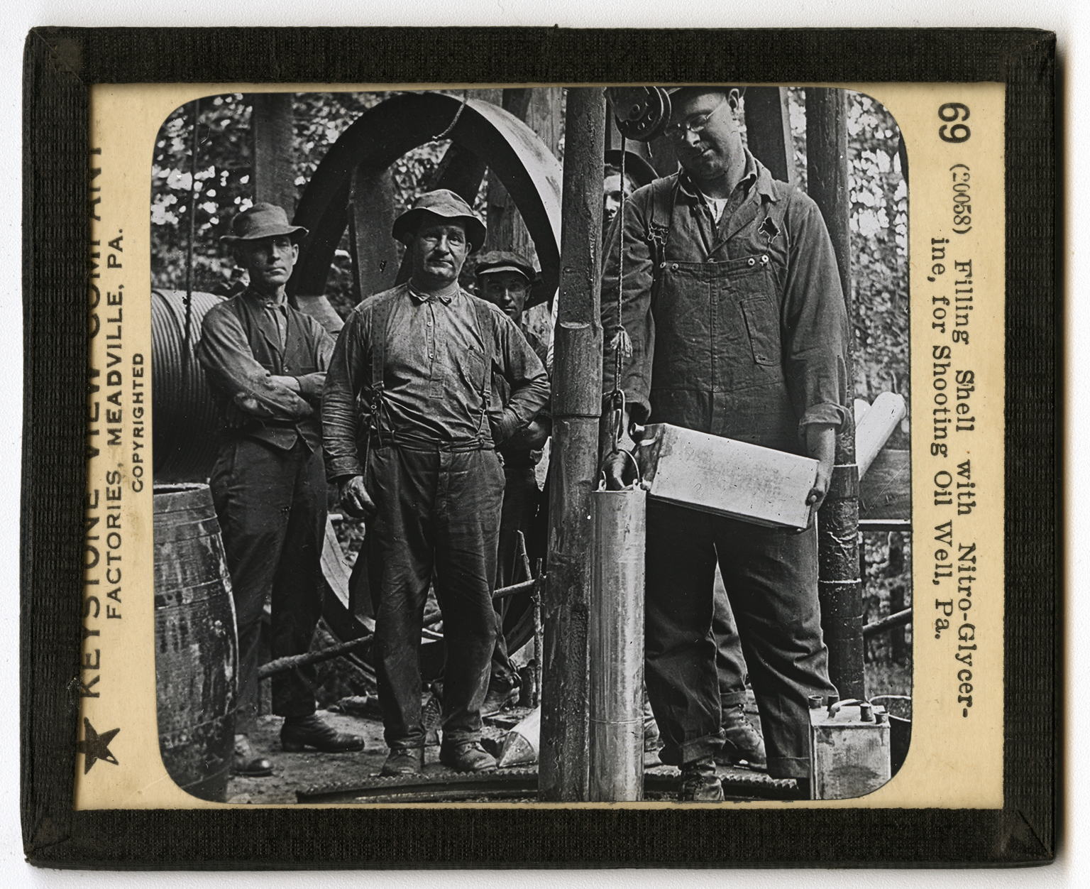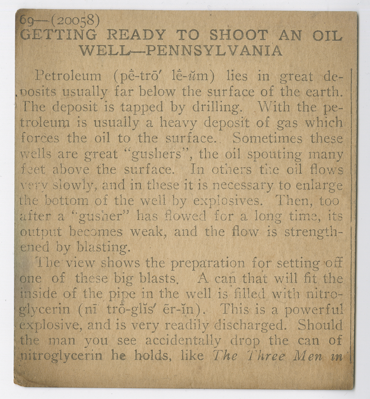Petroleum lies in great deposits usually far below the surface of the earth. The deposit is tapped by drilling. With the petroleum is usually a heavy deposit of gas which forces the oil to the surface. Sometimes these wells are great "gushers", the oil spouting many feet above the surface. In others the oil flows very slowly, and in these it is necessary to enlarge the bottom of the well by explosives. Then, too after a "gusher" has flowed for a long time, its output becomes weak, and the flow is strengthened by blasting. The view shows the preparation for setting off one of these big blasts. A can that will fit the inside of the pipe in the well is filled which nitroglycerin. This is a powerful explosive, and is very readily discharged. Should the man you see accidentally drop the can of nitroglycerin he holds, like The Three Men in