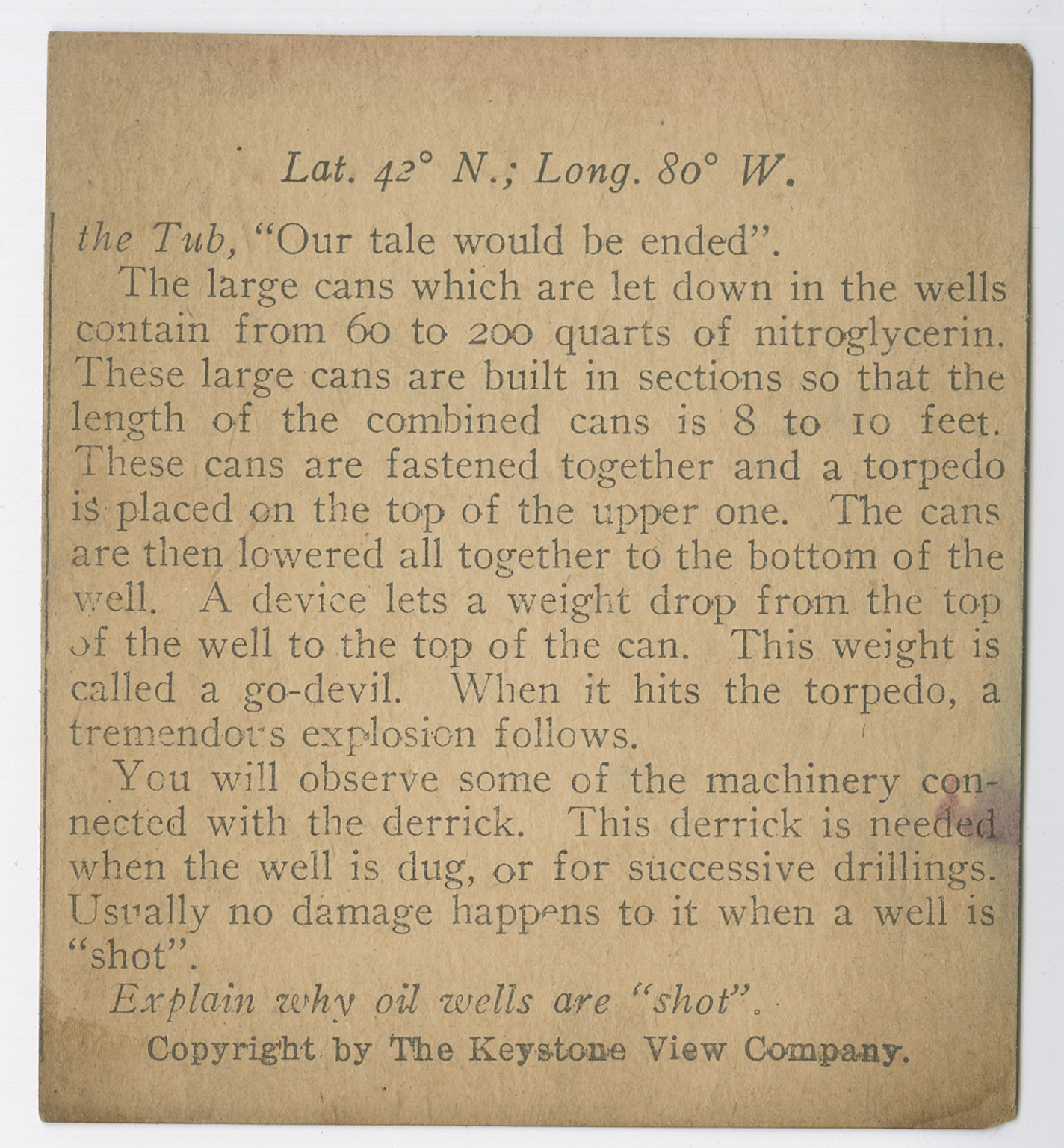 the Tub, "Our tale would be ended". The large canes which are let down in the wells contain from 60 to 200 quarts of nitroglycerin. These large cans are built in sections so that the length of the combined cans is 8 to 10 feet. These cans are fastened together and a torpedo is placed on the top of the upper one. The cans are then lowered all together to the bottom of the well. A device lets a weight drop from the top of the well to the top of the can. This weight is called a go-devil. When it hits the torpedo, a tremendous explosion follows. You will observe some of the machinery connected with the derrick. This derrick is needed when the well is dug, or for successive drillings. Usually no damage happens to it when a well is "shot". Explain why oil wells are "shot".