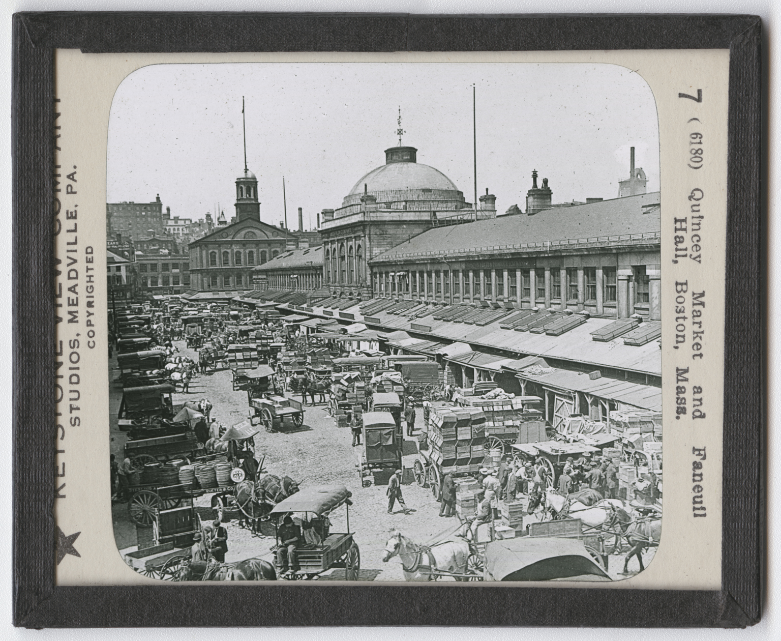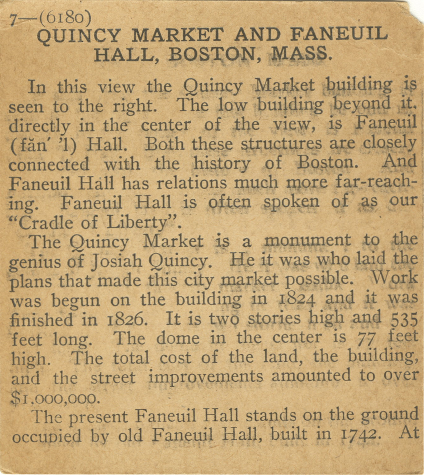 In this view the Quincy Market building is seen to the right. The low building beyond it, directly in the center of the view, is Faneuil (----) Hall. Both these structures are closely connected with the history of Boston. And Faneuil Hall has relations much more far-reaching. Faneuil Hall is often spoken of as our "Cradle of Liberty". The Quincy Market is a monument to the genius of Josiah Quincy. He it was who laid the plans that made this city market possible. Work was begun on the building in 1824 and it was finished in 1826. It is two stories high and 535 feet long. The dome in the center is 77 feet high. The total cost of the land, the building, and the street improvements amounted to over $1,000,000. The present Faneuil Hall stands on the ground occupied by the old Faneuil Hall, built in 1742. At