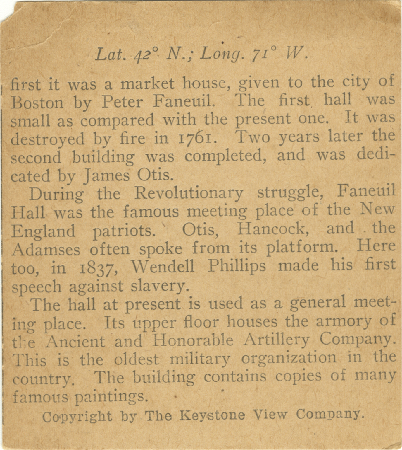 first it was a market house, given to the city of Boston by Peter Faneuil. The first hall was small as compared with the present one. It was destroyed by fire in 1761. Two years later the second building was completed, and was dedicated by James Otis. During the Revolutionary struggle, Faneuil Hall was the famous meeting place of the New England patriots. Otis, Hancock, and the Adamses often spoke from its platform. Here too, in 1837, Wendell Phillips made his first speech against slavery. The hall at present is used as a general meeting place. Its upper floor houses the armory of the Ancient and Honorable Artillery Company. This is the oldest military organization in the country. The building contains copies of many famous paintings.