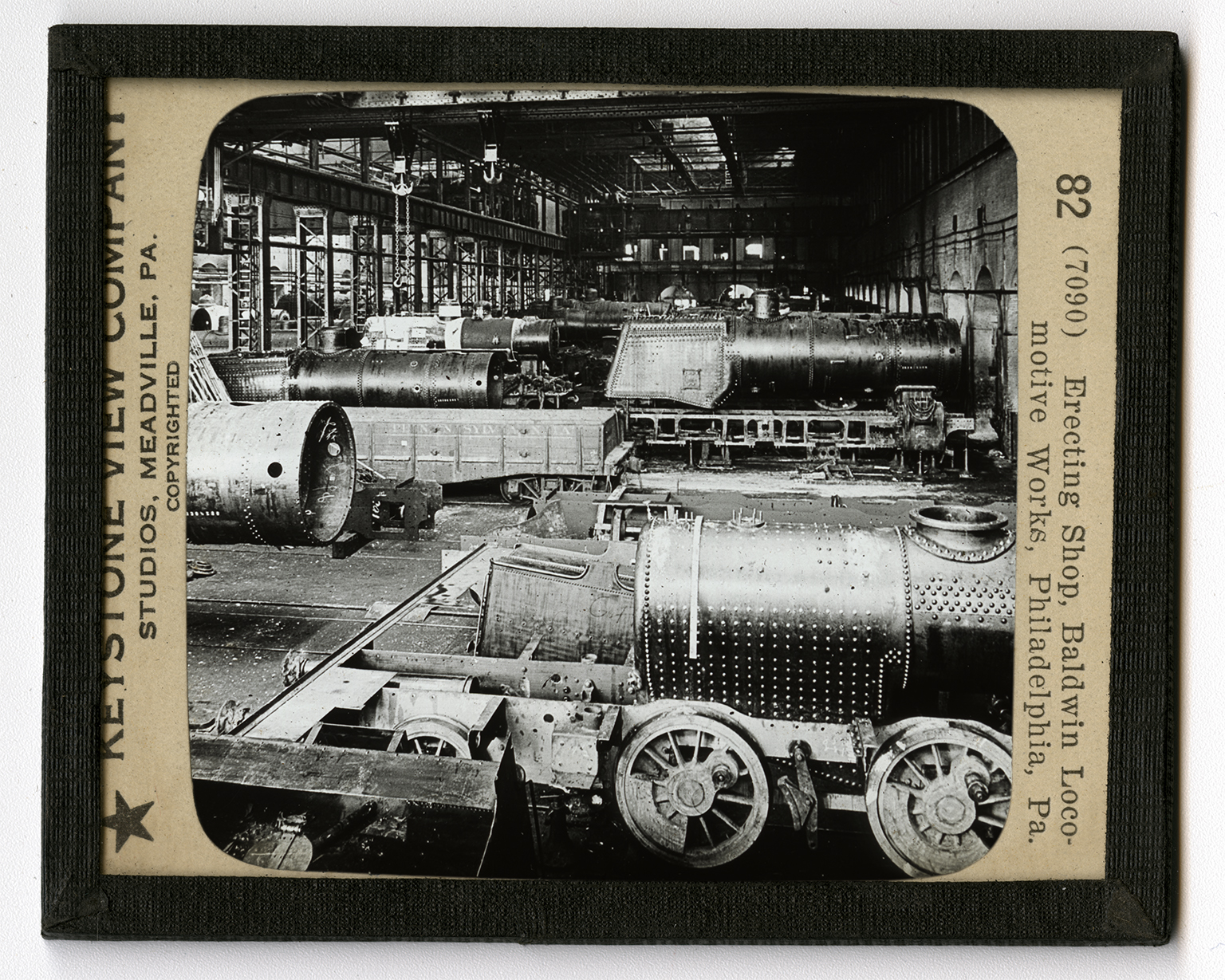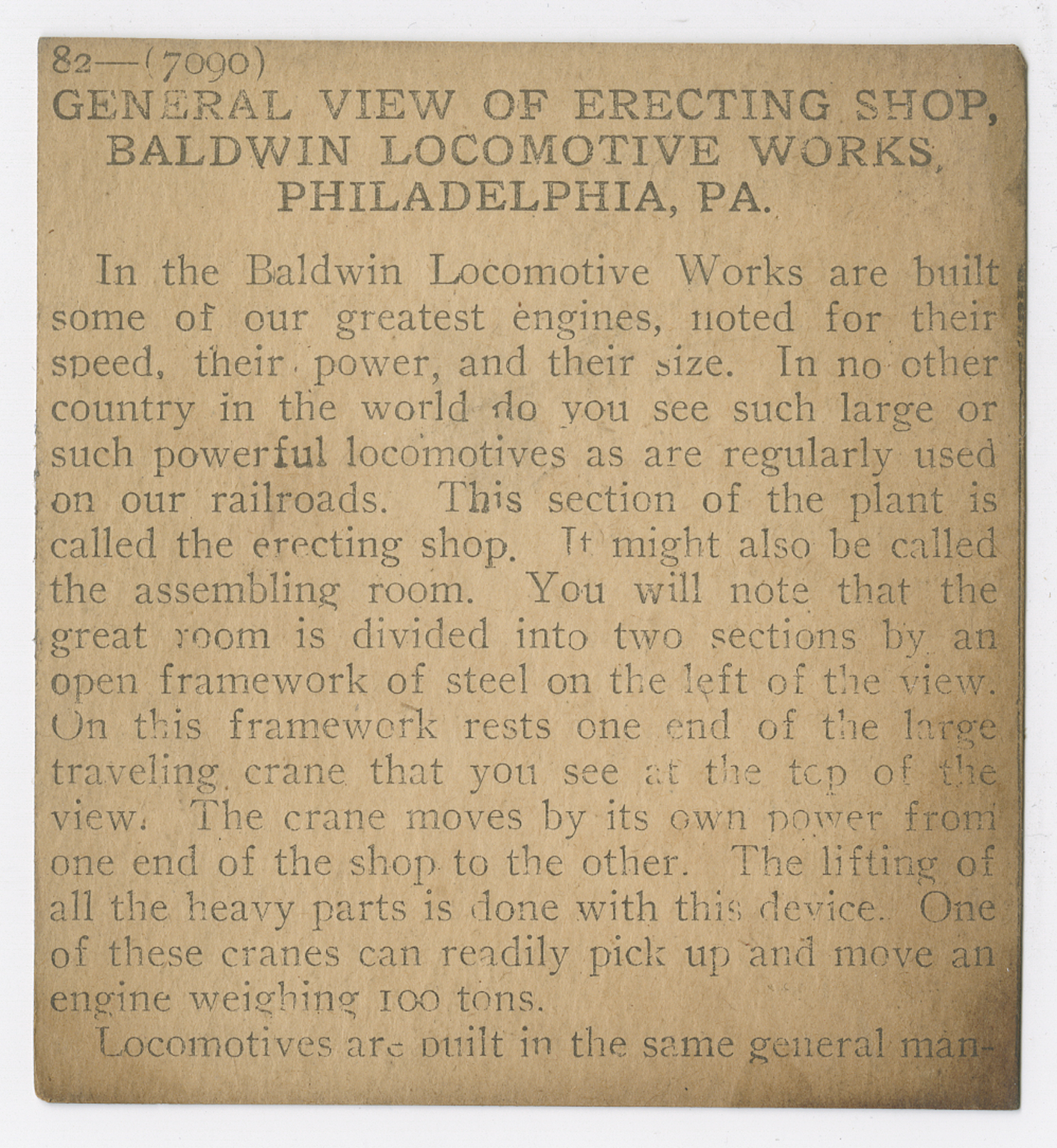 In the Baldwin Locomotive Works are built some of our greatest engines, noted for their speed, their power, and their size. In no other country in the world do you see such large or such powerful locomotives as are regularly used on our railroads. This section of the plant is called the erecting shop. It might also be called the assembling room. You will note that the great room is divided into two sections by an open framework of steel on the left of the view. On this framework rests one end of the large traveling crane that you see at the top of the view. The crane moves by its own power from one end of the shop to the other. The lifting of all the heavy parts is done with this device. One of these cranes can readily pick up and move an engine weighing 100 tons. Locomotives are built in the same general man-