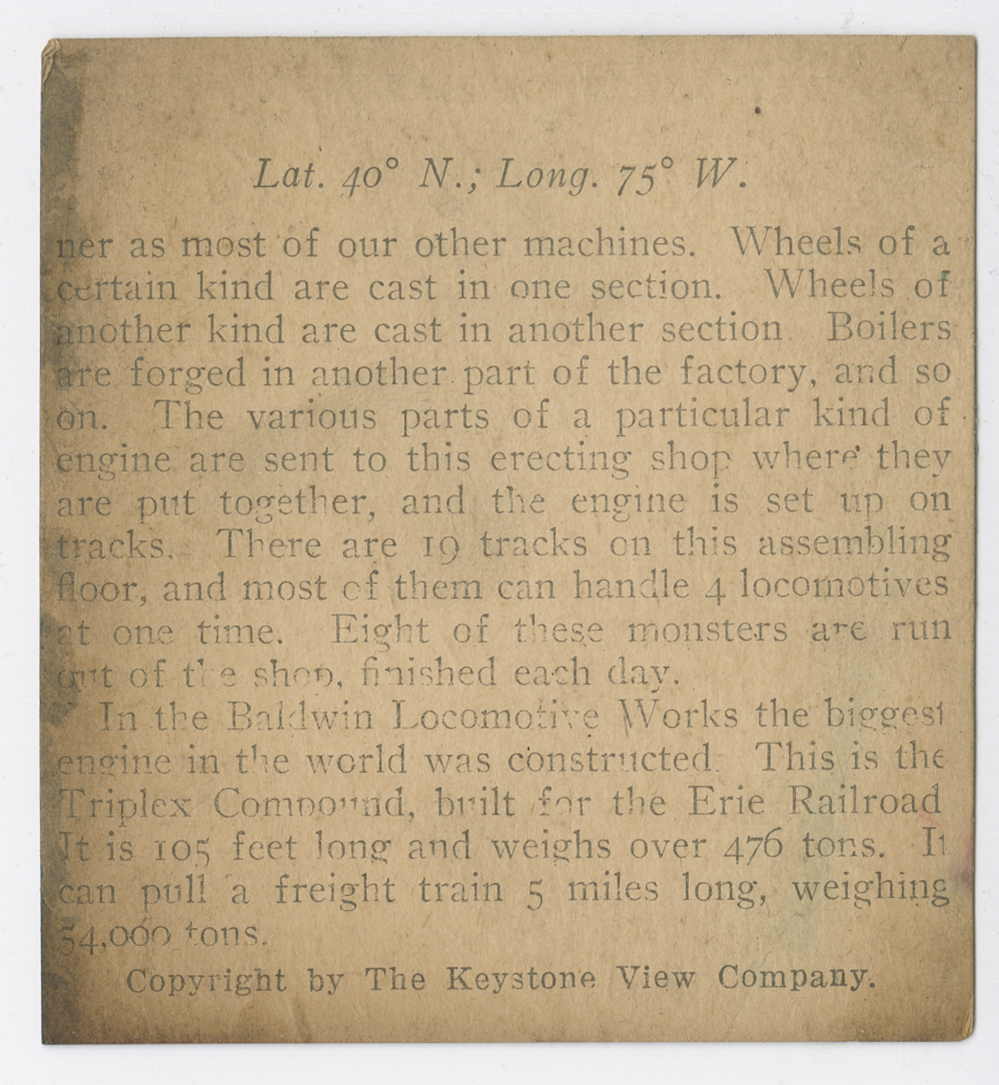 ner as most of our other machines. Wheels of a certain kind are cast in one section. Wheels of another kind are cast in another section. Boilers are forged in another part of the territory, and so on. The various parts of a particular kind of engine are sent to this erecting shop where they are put together, and the engine is set up on the tracks. There are 19 tracks on this assembling floor, and most of them can handle 4 locomotives at one time. Eight of these monsters are run out of the shop, finished each day. In the Baldwin Locomotive Works the biggest engine in the world was constructed. This is the Triplex Compound, built for the Erie Railroad. It is 105 feet long and weighs over 476 tons. It can pull a freight train 5 miles long, weighing 54,000 tons.