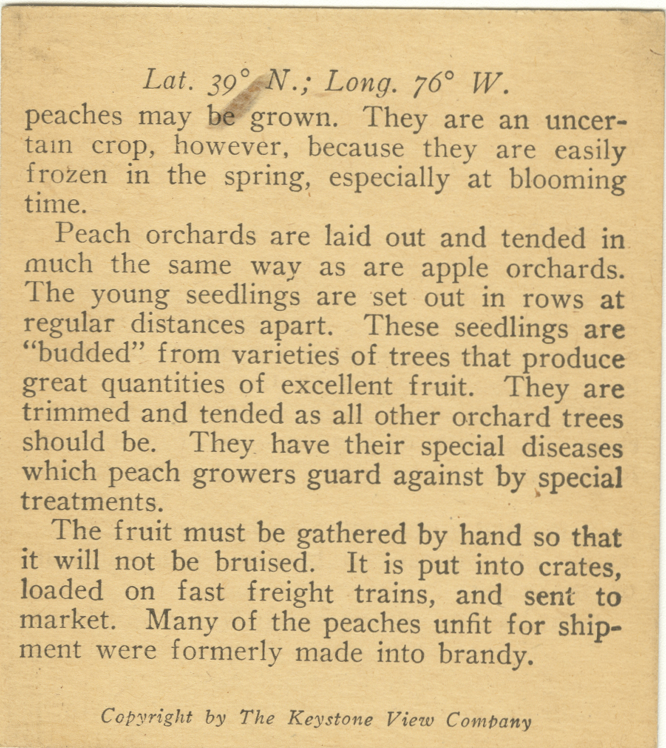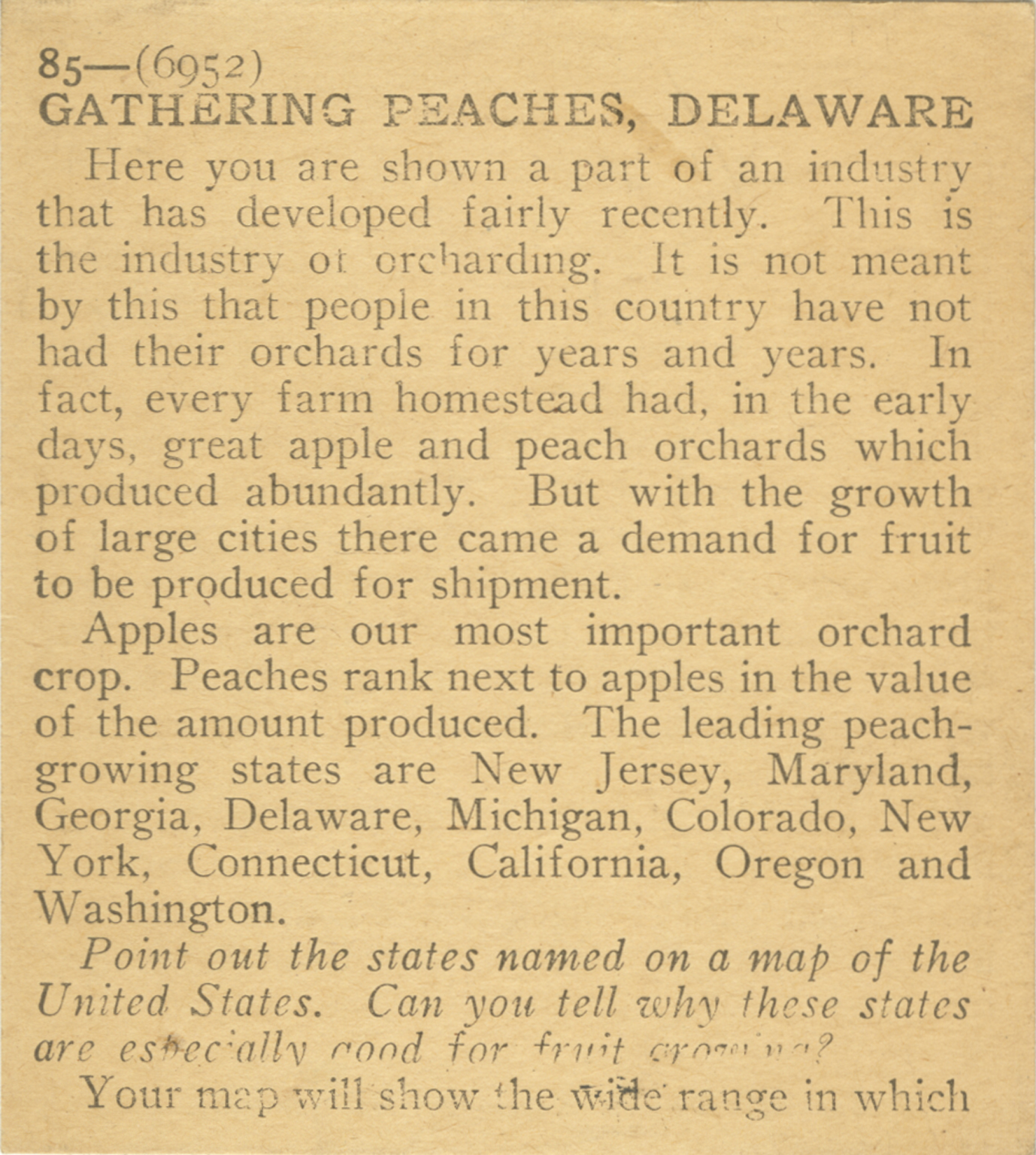 Here you are shown a part of an industry that has developed fairly recently. This is the industry of orcharding. It is not meant by this that people in this country have not had their orchards for years and years. In fact, every farm homestead had, in the early days, great apple and peach orchards which produced abundantly. But with the growth of large cities there came a demand for fruit to be produced for shipment. Apples are our most important orchard crop. Peaches ranks next to apples in the value of the amount produced. The leading peach-growing states are New Jersey, Maryland, Georgia, Delaware, Michigan, Colorado, New York, Connecticut, California, Oregon and Washington. Point out the states named on a map of the United States. Can you tell why these states are especially good for fruit growing? Your map will show the wide range in which