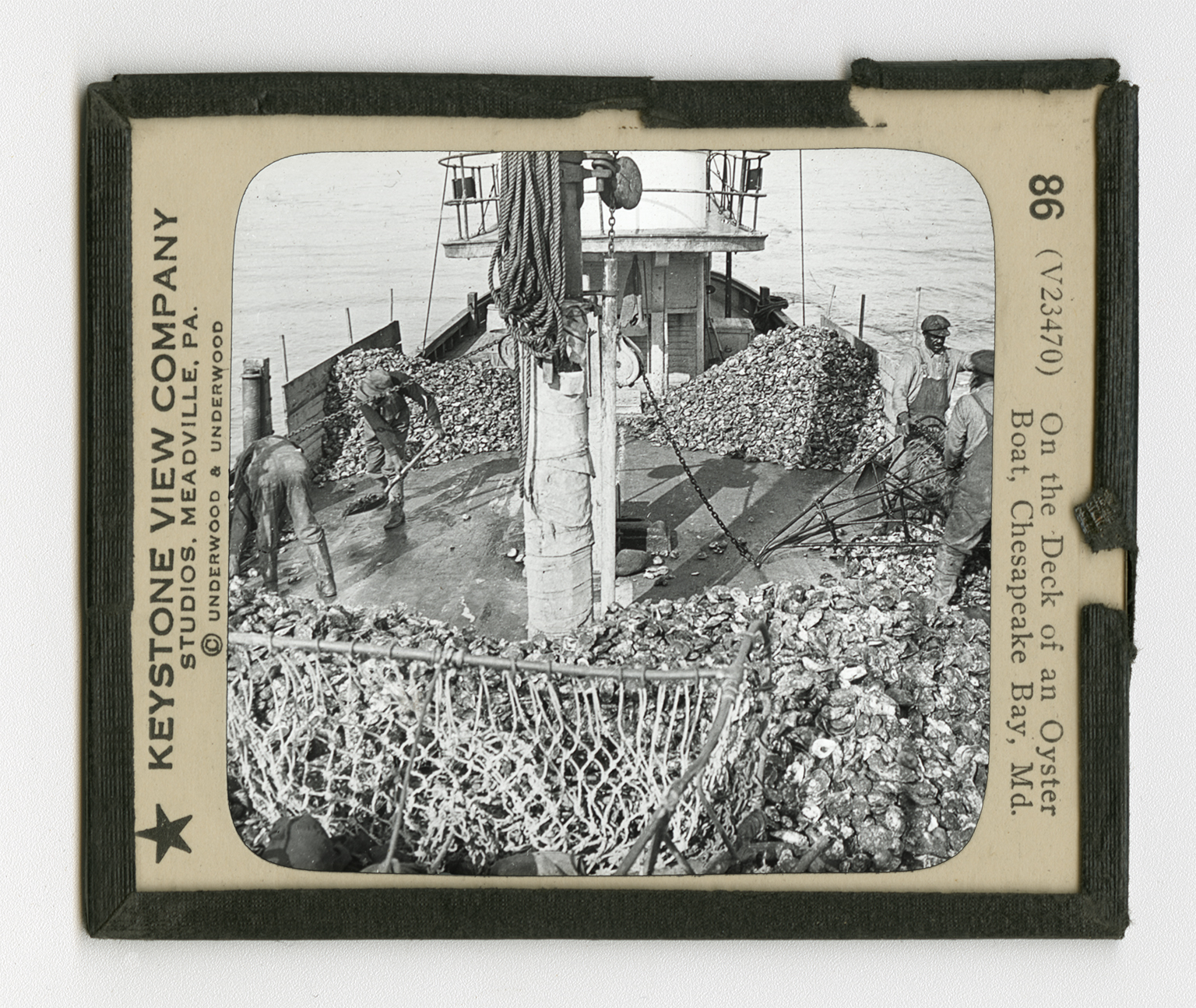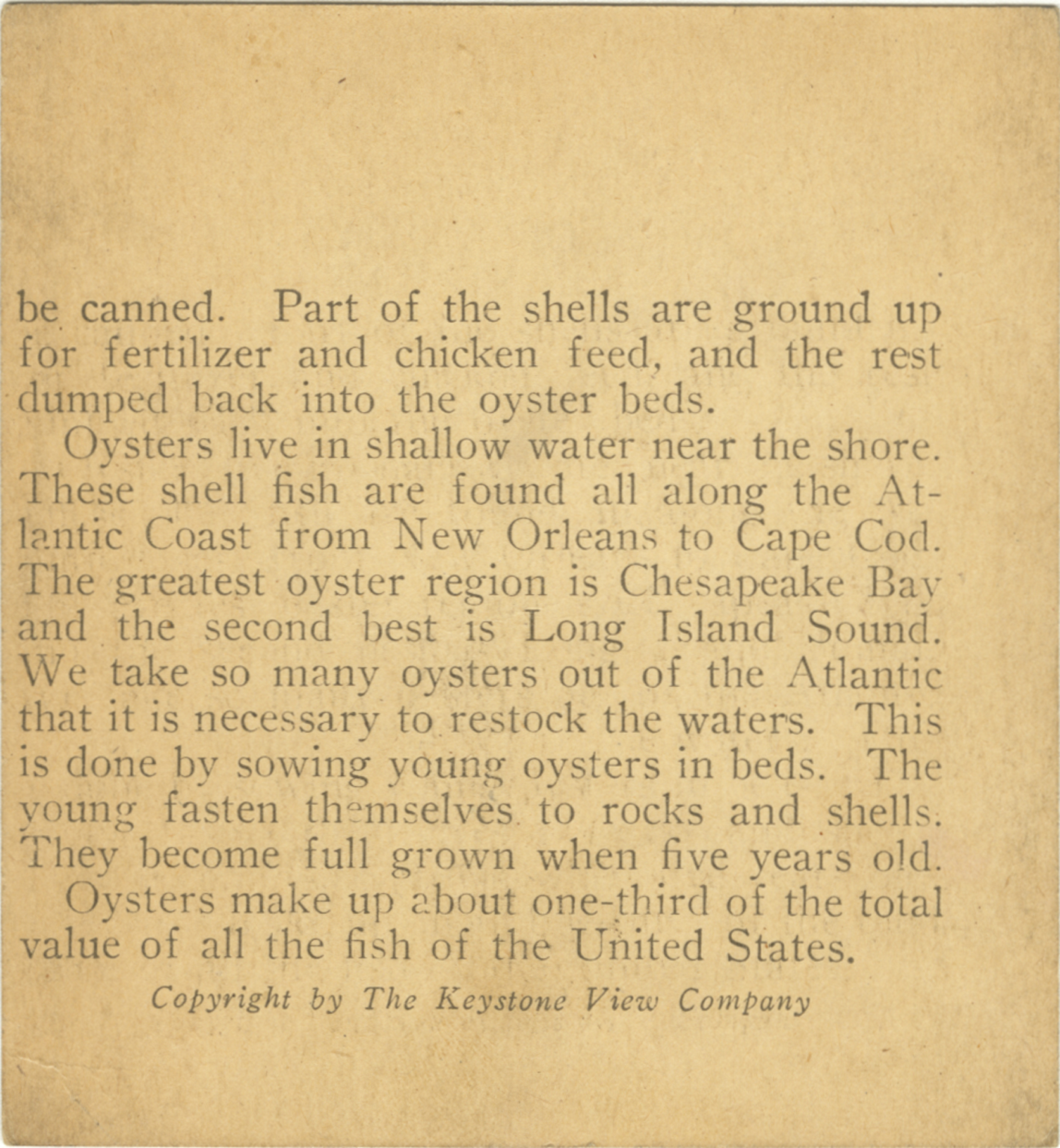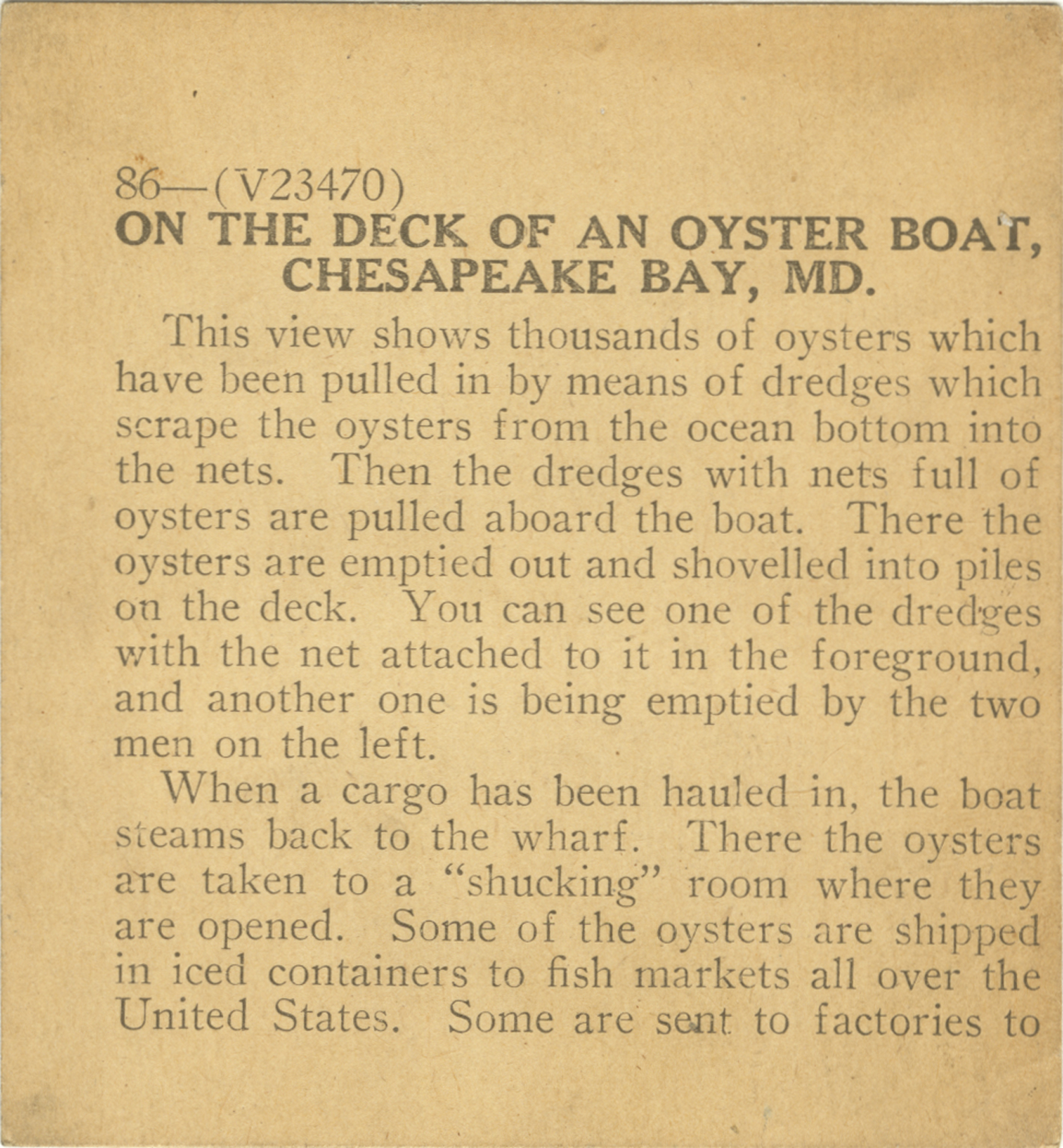 This view shows thousands of oysters which have been pulled in by means of dredges which scrape the oysters from the ocean bottom into nets. Then the dredges with nets full of oysters are pulled aboard the boat. There the oysters are emptied out and shoveled into piles on the deck. You can see one of the dredges with the net attached to it in the foreground, and another one is being emptied by the two men on the left. When a cargo has been hauled in, the boat steams back to the wharf. There the oysters are taken to a "shucking" room where they are opened. Some of the oysters are shipped in ice containers to fish markets all over the United States. Some are sent to factories to