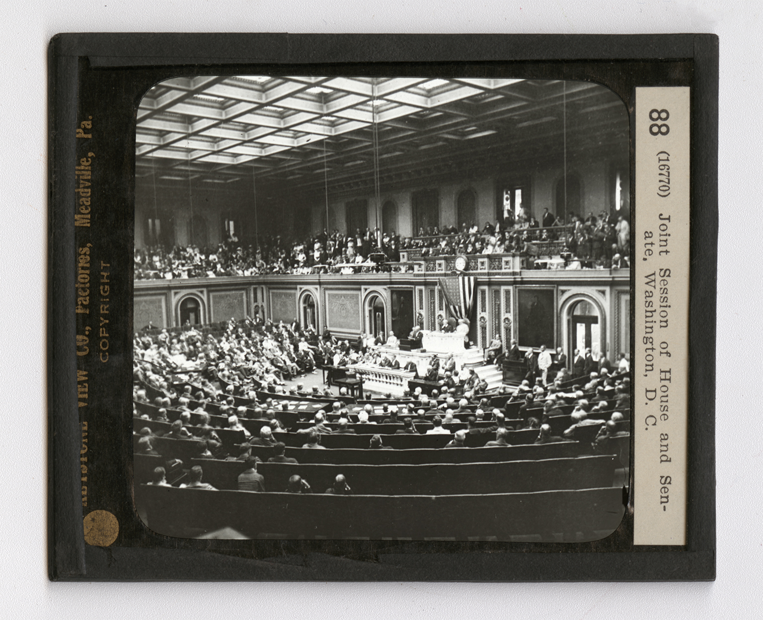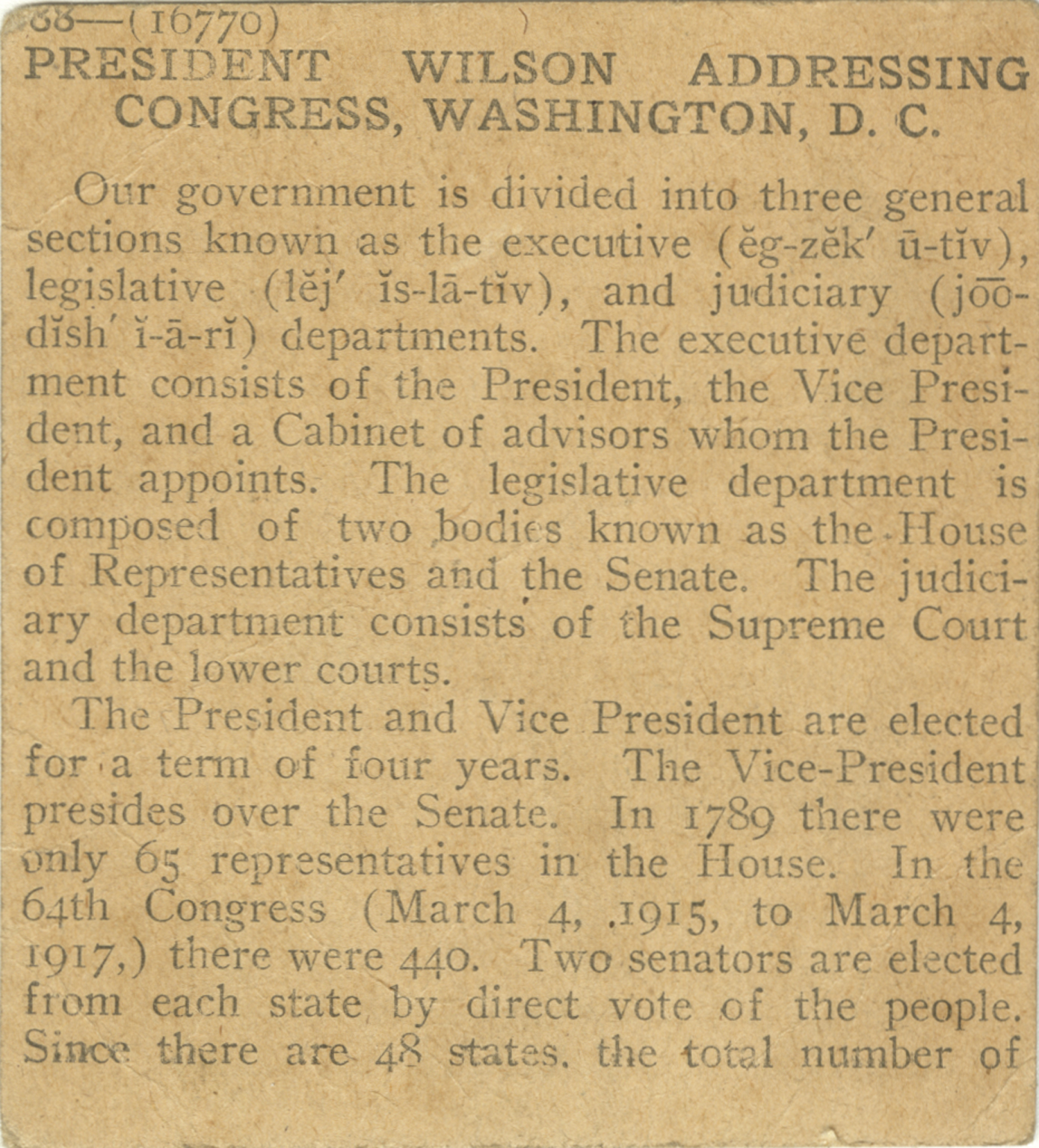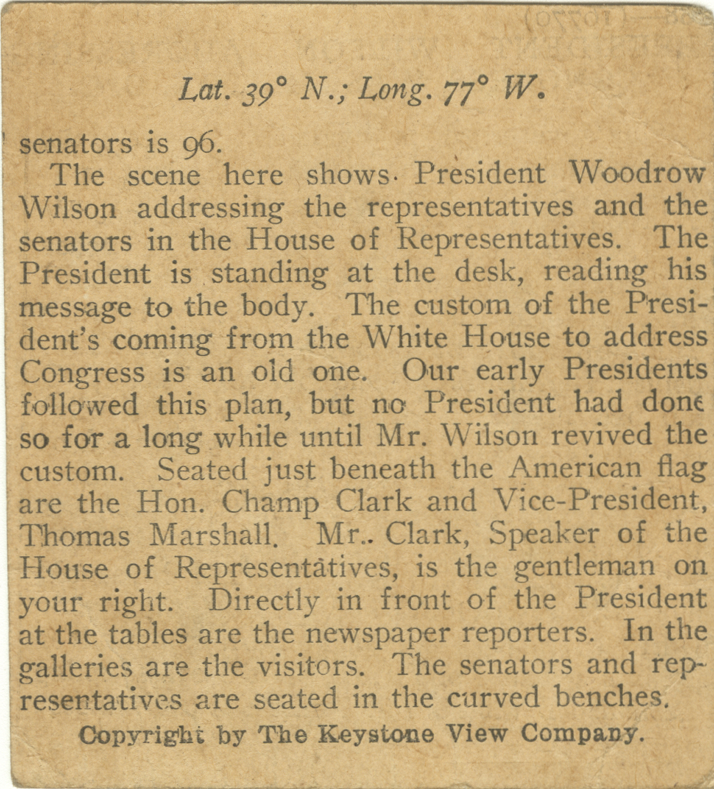senators is 96. The scene here shows President Woodrow Wilson addressing the representatives and the senators in the House of Representatives. The President is standing at the desk, reading his message to the body. The custom of the President's coming from the White House to address Congress is an old one. Our early Presidents followed this plan, but no President had done so for a long while until Mr. Wilson revived the custom. Seated just beneath the American flag are the Hon. Champ Clark and Vice-President, Thomas Marshall. Mr. Clark, Speaker of the House of Representatives, is the gentleman on your right. Directly in front of the President at the tables are the newspaper reporters. In the galleries are the visitors. The senators and representatives are seated in curved benches.