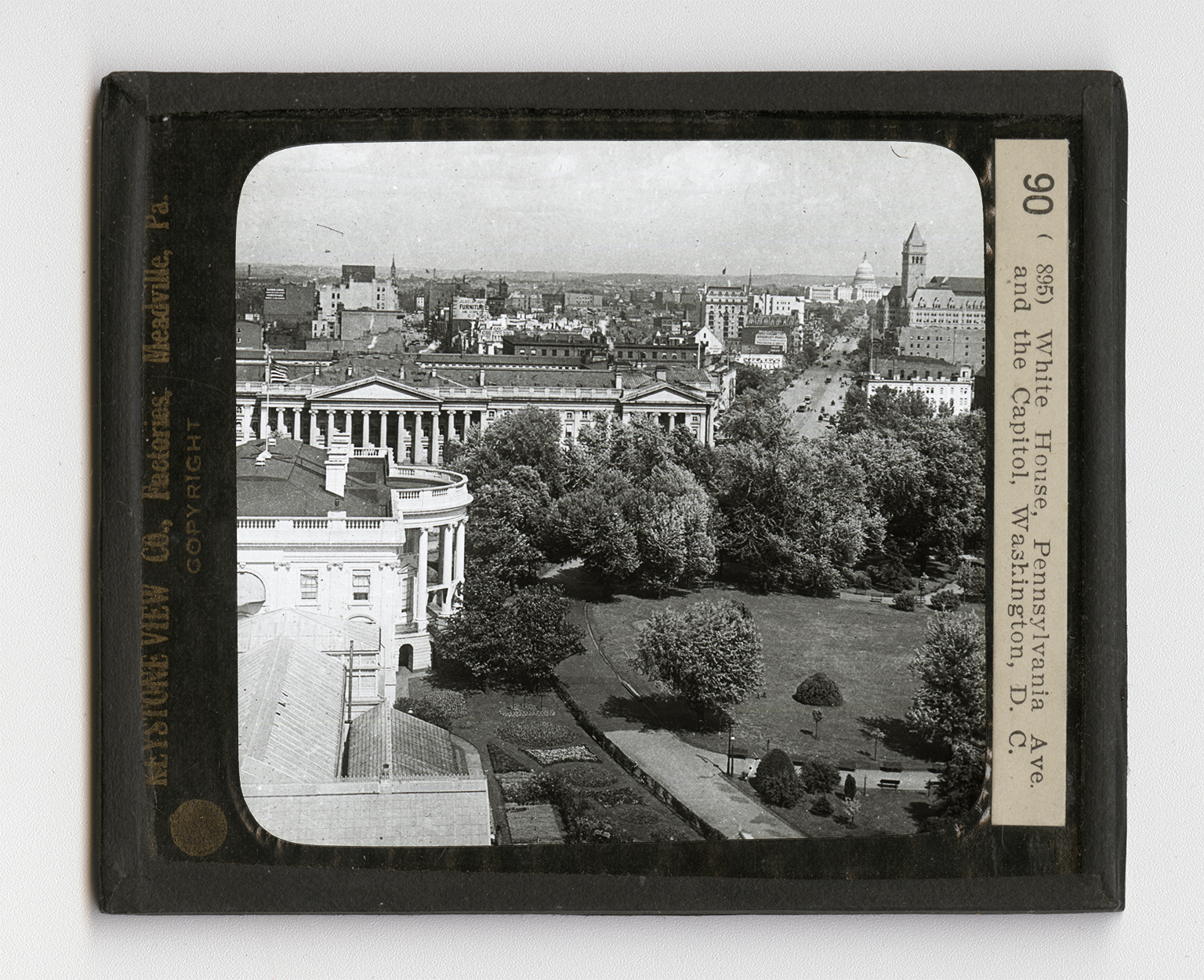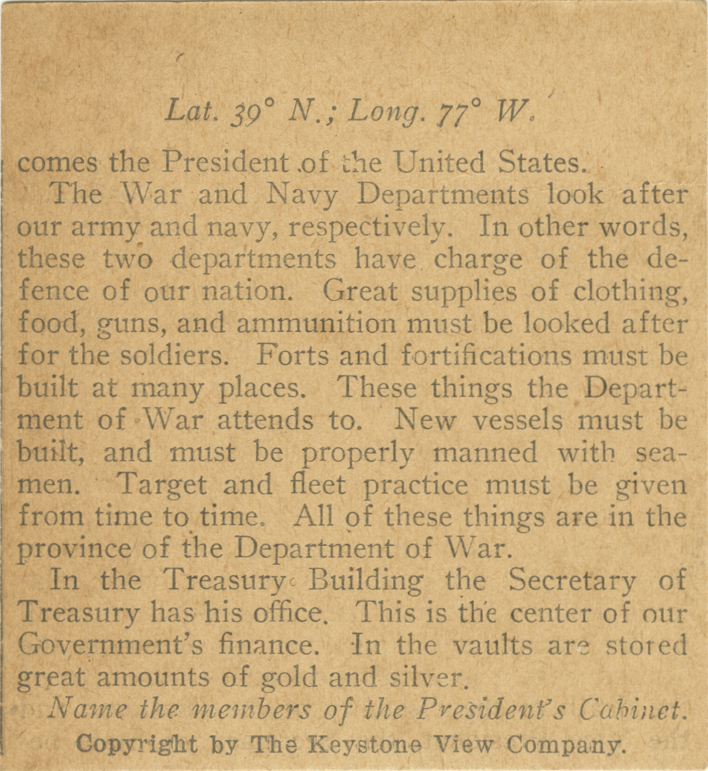 You are here looking from the War, State, and Navy Building. On the left of the building with the round portico is the White House in which the President lives. It is the White House grounds that occupy the center of the scene. Beyond the White House is the United States Treasury Building with the Greek porticoes. At the farther end of Pennsylvania Avenue is the United States Capitol Building. The War, State, and Navy Building house these three departments of our Government. Each is presided over by a special secretary. The State Department is ruled by the Secretary of State. It is he who attends to our relations with foreign nations. He is the head of all of the many men appointed to represent the United States in foreign countries. In case of the death or disability of the President and the Vice President, the Secretary of State be-
