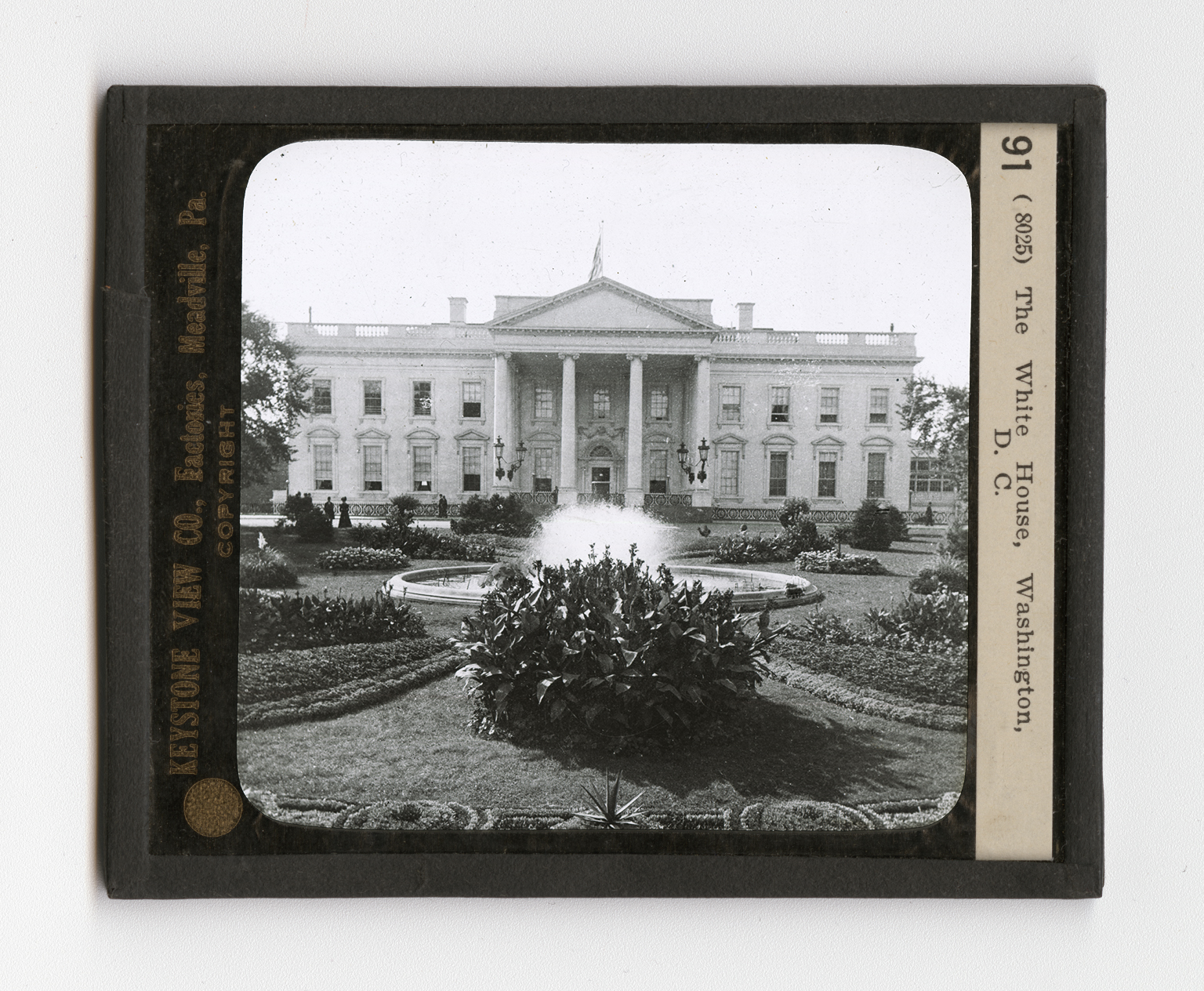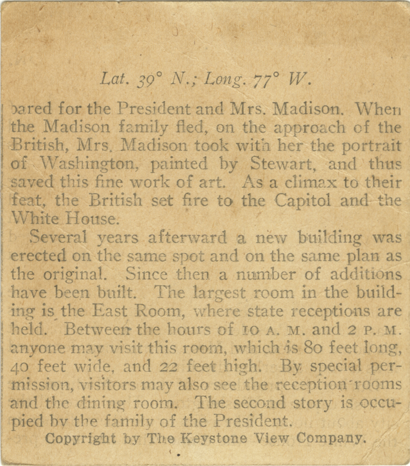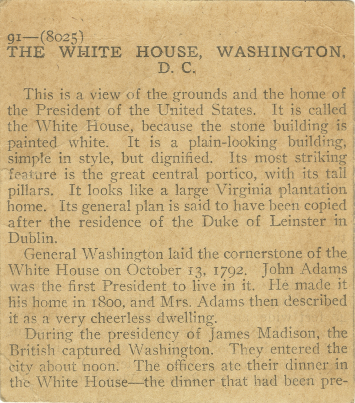 This is a view of the grounds and the home of the President of the United States. It is called the White House, because the stone building is painting white. it is a plain-looking building, simple in style, but dignified. Its most striking feature is the great central portico, with its tall pillars. It looks like a very large Virginia plantation home. Its general plan is said to have been copied after the residence of the Duke of Leinster in Dublin. General Washington laid the cornerstone of the White House on October 13, 1792. John Adams was the first President to live in it. He made it his home in 1800, and Mrs. Adams then described it as a very cheerless dwelling. During the presidency of James Madison, the British captured Washington. They entered the city about noon. The officers ate their dinner in the White House--the dinner that had been pre-