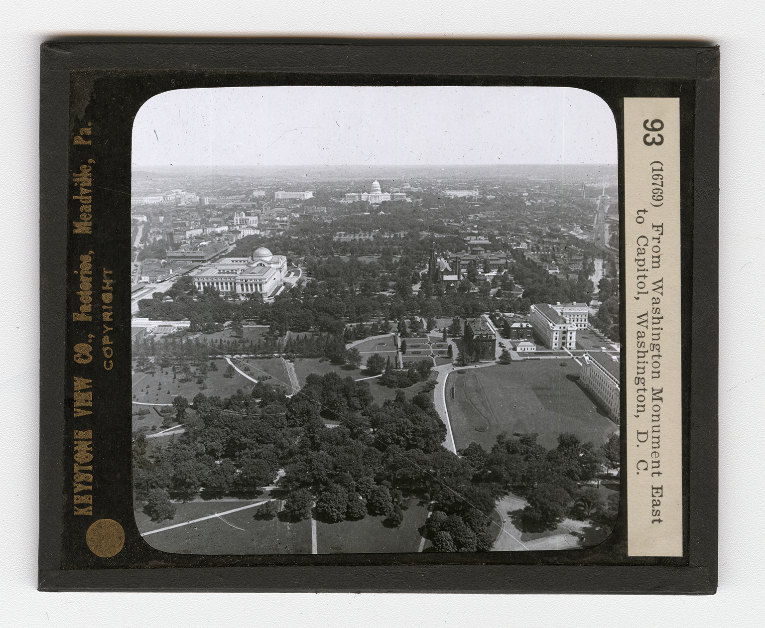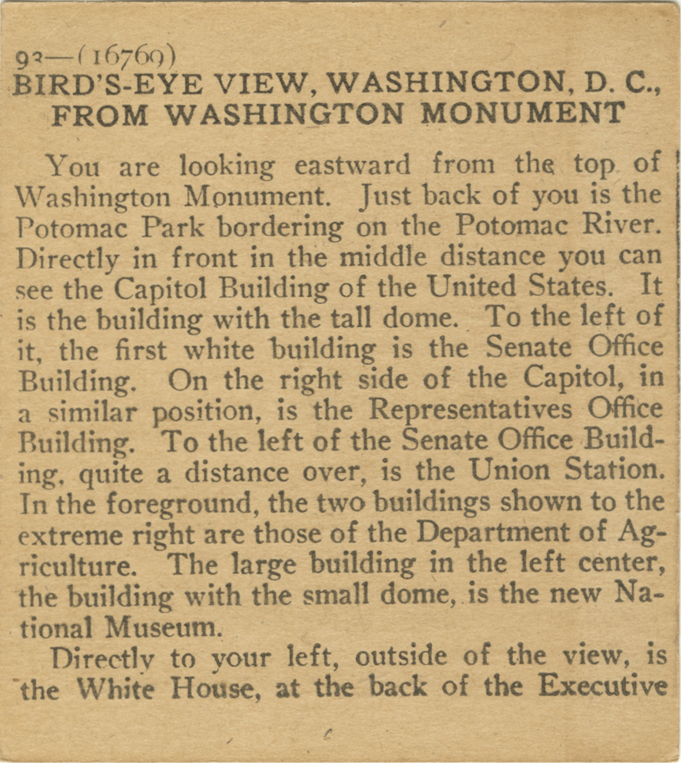 You are looking eastward from the top of Washington Monument. Just back of you is the Potomac Park bordering on the Potomac River. Directly in front in the middle distance you can see the Capitol Building of the United States. It is the building with the tall dome. To the left of it, the first white building is the Senate Office Building. On the right side of the Capitol, in a similar position, is the Representatives Office Building. To the Left of the Senate Office Building, quite a distance over, is the Union Station. In the foreground, the two buildings shown to the extreme right are those of the Department of Agriculture. The large building in the left center, the building with the small dome, is the new National Museum. Directly to your left, outside of the view, is the White House, at the back of the Executive