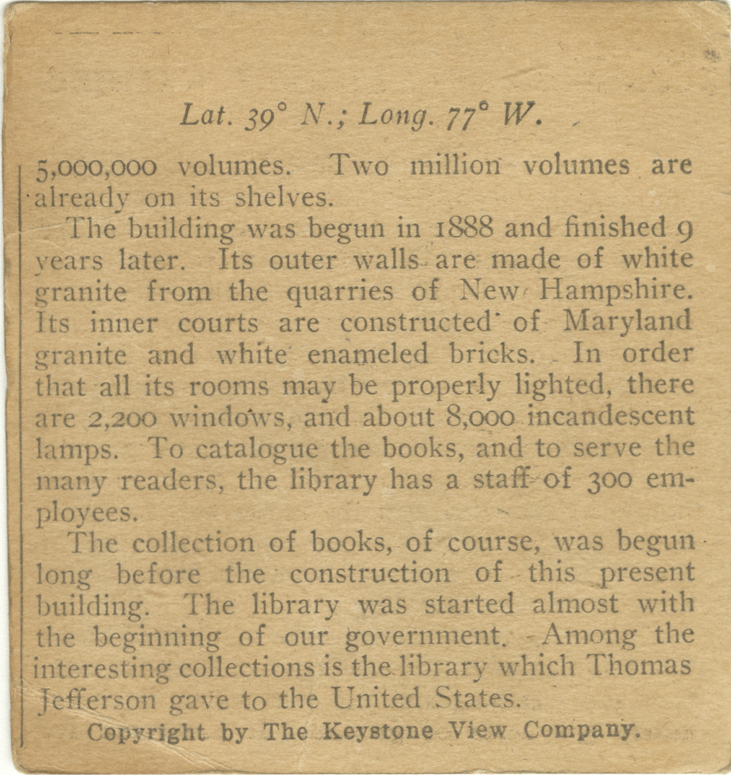 5,000,000 volumes. Two million volumes are already on its shelves. The building was begun in 1888 and finished 9 years later. Its outer walls are made of white granite from the quarries of New Hampshire. Its inner courts are constructed of Maryland granite and white enameled bricks. In order that all its rooms may be properly lighted, there are 2,200 windows, and about 8,000 incandescent lamps. To catalogue the books, and to serve the many readers, the library has a staff of 300 employees. The collection of books, of course, was begun long before the construction of this present building. The library was started almost with the beginning of our government. Among the interesting collections is the library which Thomas Jefferson gave to the United States.