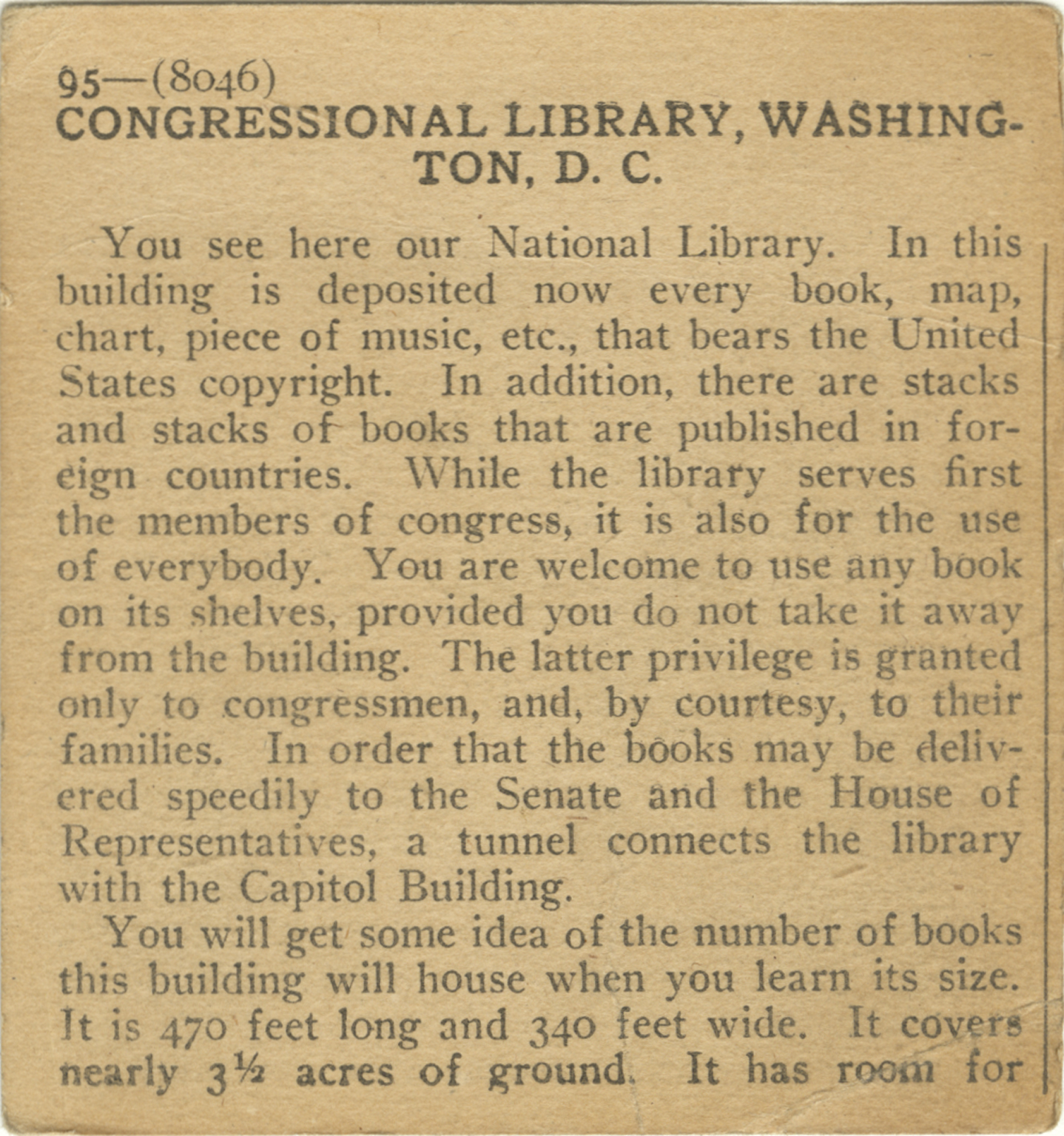 You see here our National Library. In this building is deposited now every book, map, chart, piece of music, etc., that bears the United States copyright. In addition, there are stacks and stacks of books that are published in foreign countries. While the library serves first the members of congress, it is also for the use of everybody. You are welcome to use any book on its shelves, provided you do not take it away from the building. The latter privilege is granted only to congressmen, and, by courtesy, to their families. In order that the books may be delivered speedily to the Senate and the House of Representatives, a tunnel connects the library with the Capitol Building. You will get some idea of the number of books this building will house when you learn its size. It is 470 feet long and 340 feet wide. It covers nearly 3 1/2 acres of ground. It has room for
