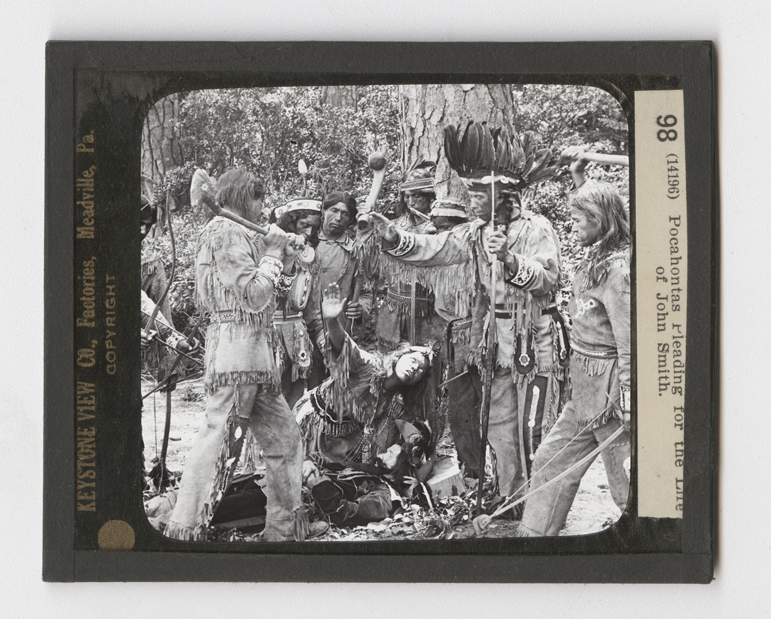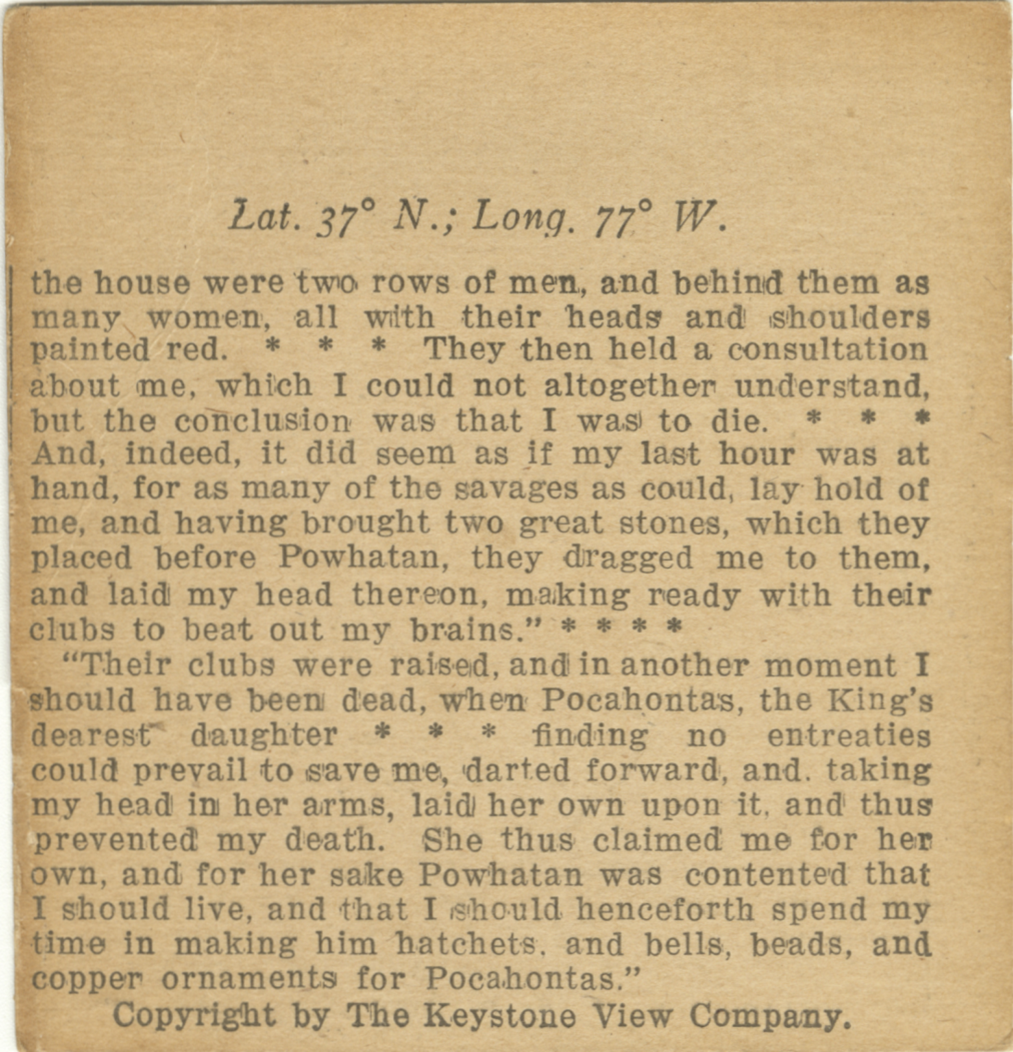 the house were two rows of men, and behind them as many women, all with their heads and shoulders painted red. They then held a consultation about me, which I could not altogether understand, and the conclusion was that I was to die. And, indeed, it did seem as if my last hour was at hand, for as many of the savages as could, law hold of me, and having brought two great stones, which they placed before Powhatan, they dragged me to them, and laid my head thereon, making ready with their clubs to beat out my brains." "Their clubs were raised, and in another moment I should have been dead, when Pocahontas, the King's dearest daughter, finding no entreaties could prevail to save me, darted forward, and taking my head in her arms, laid her own upon it, and thus prevented my death. She thus claimed me for her own, and for her sake Powhatan was contented that I should live, and that I should henceforth spend my time in making him hatchets and bells, beads, and copper ornaments for Pocahontas."